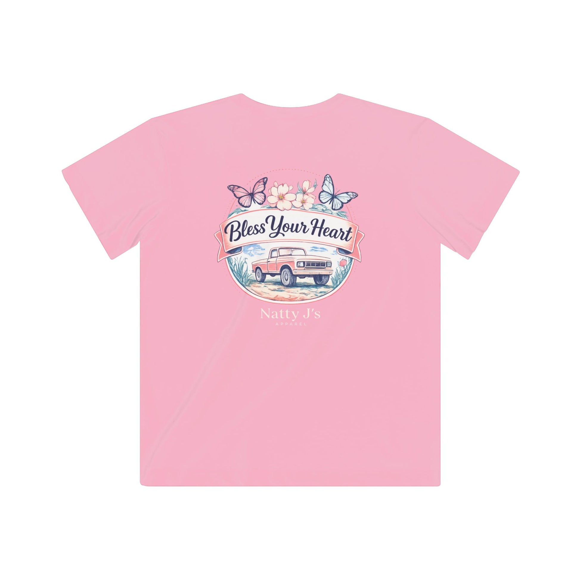 Our āBless Your Heartā graphic tee from Natty Jās Apparel features a beautifully illustrated vintage pickup truck, soft florals, and fluttering butterfliesāmaking it the perfect blend of Southern hospitality and classic boutique style.